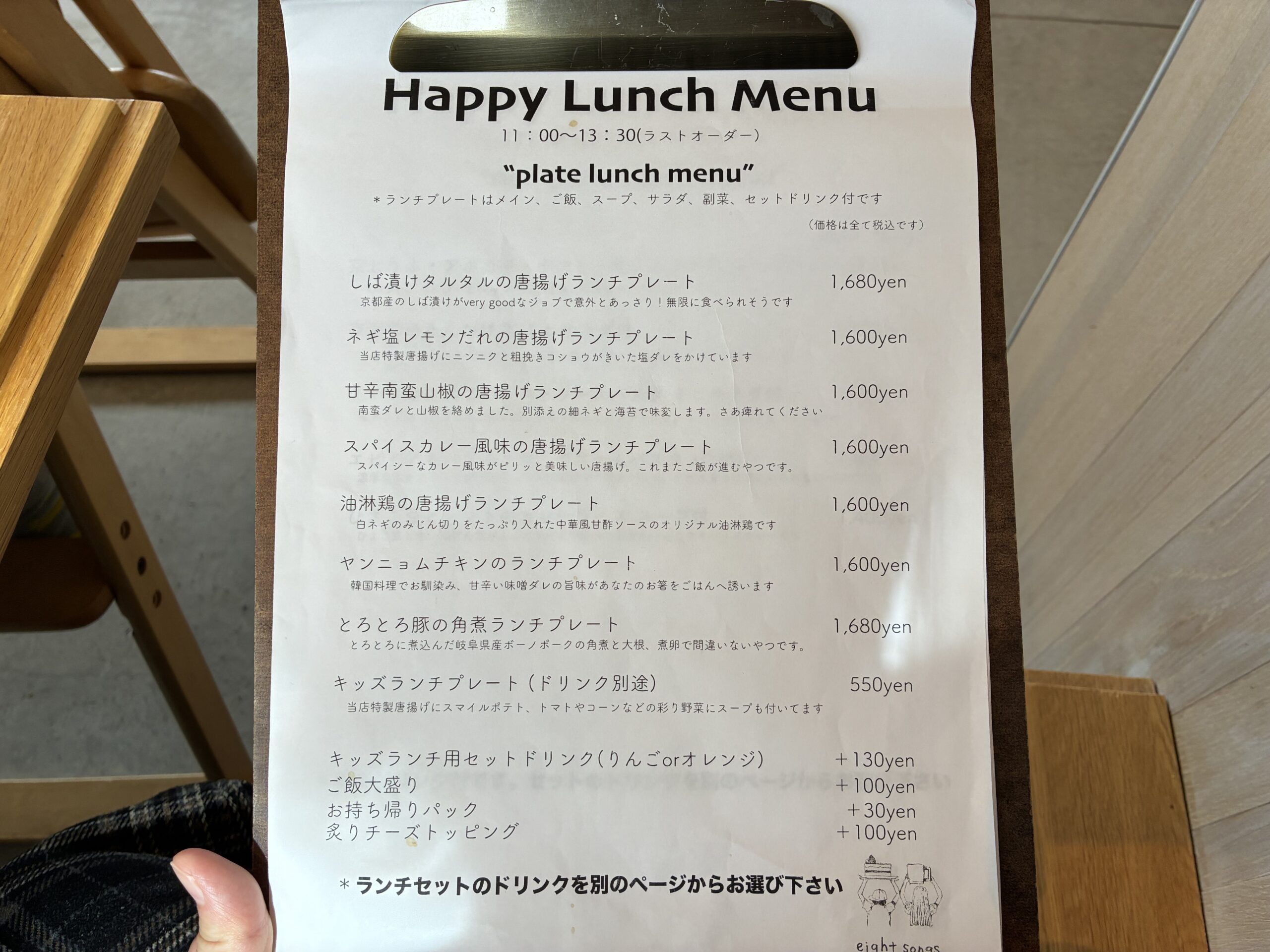- 休業日 : 木曜日とその他イベント出店日等(詳しくは@cafe_eightsongs参照)
