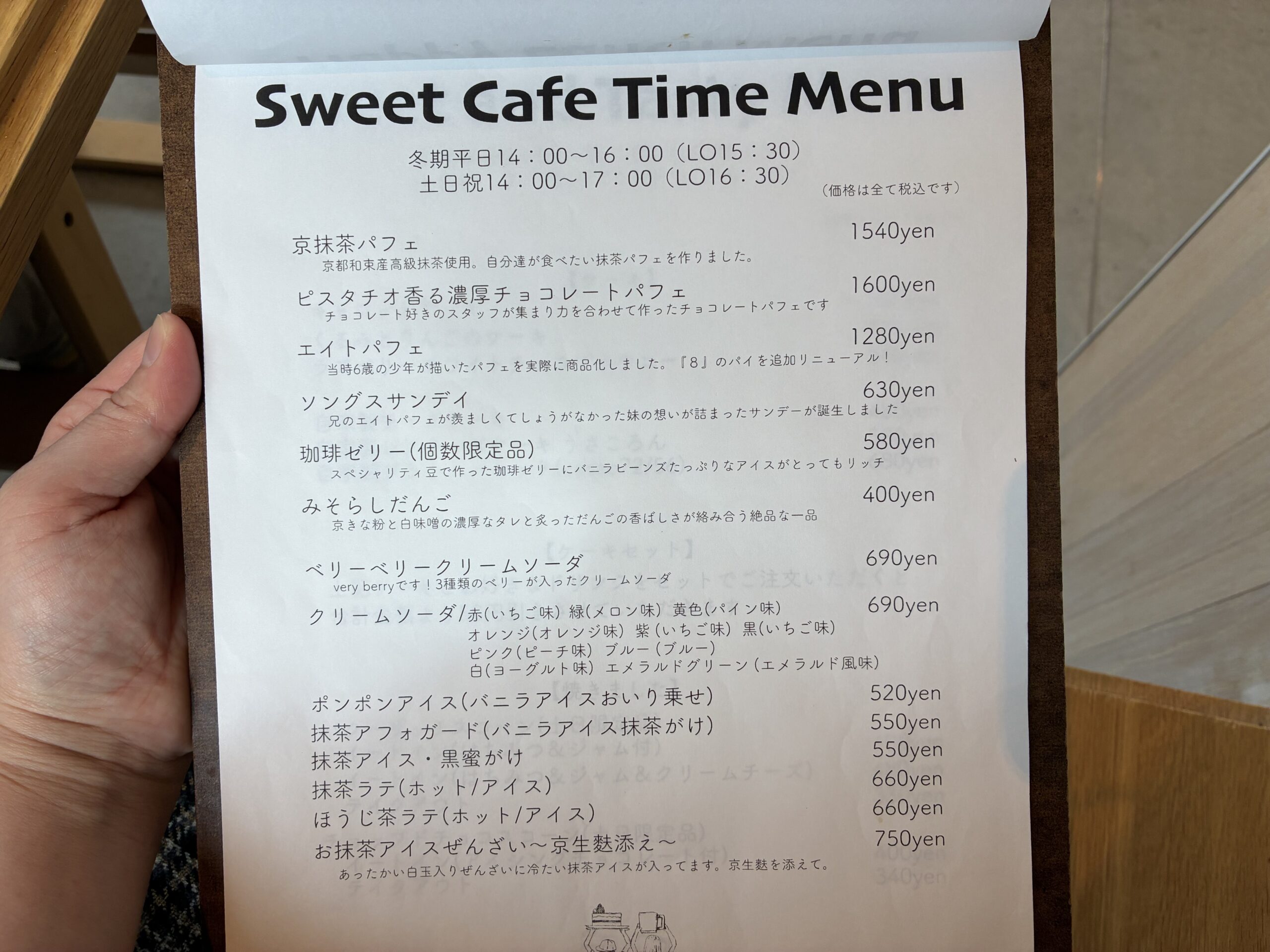 メニューには抹茶パフェをはじめ、京スイーツがずらり。
