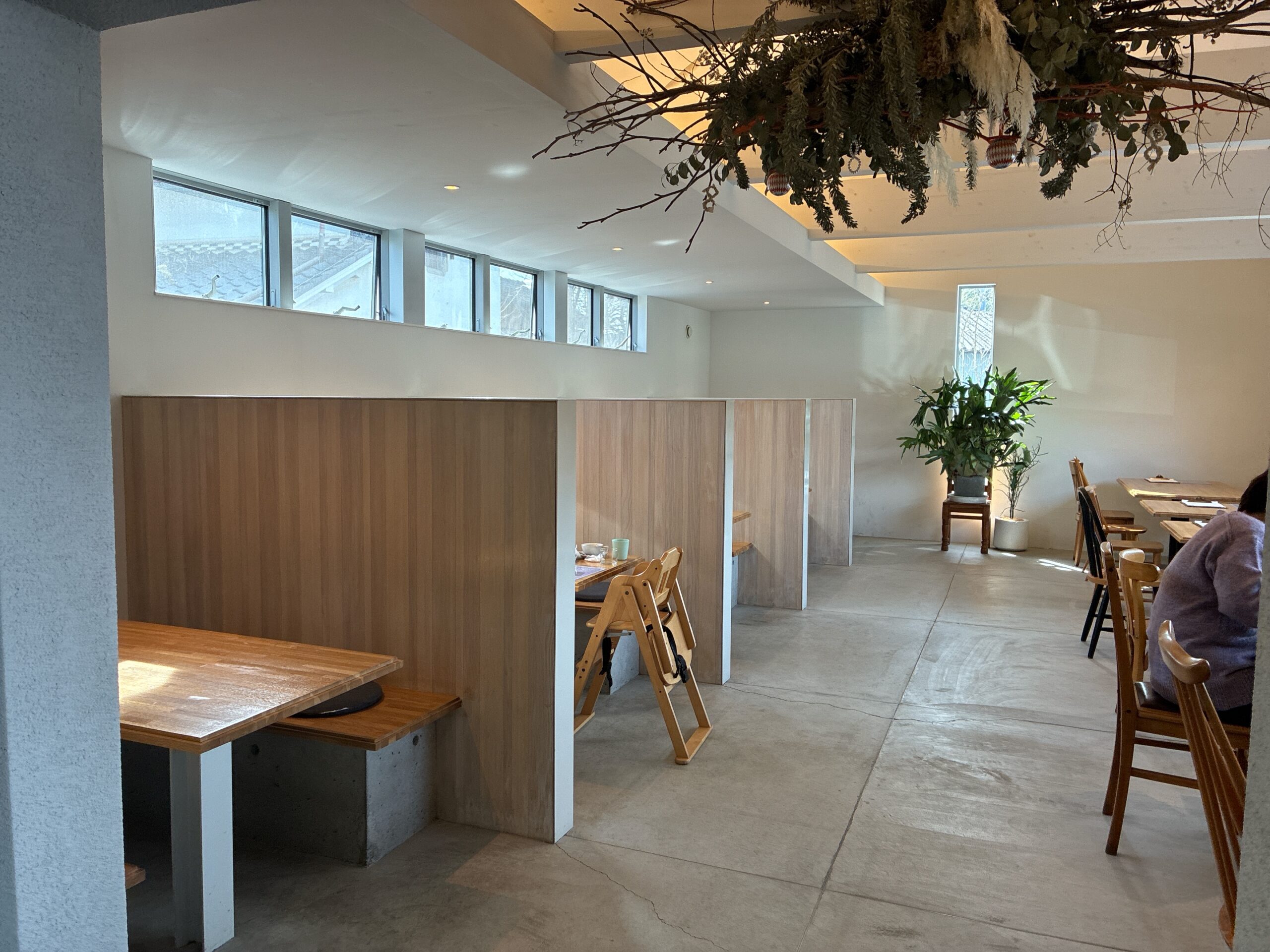 シンプルな内装の中に、目をひく入り口天井等、所々に植物も飾られています。