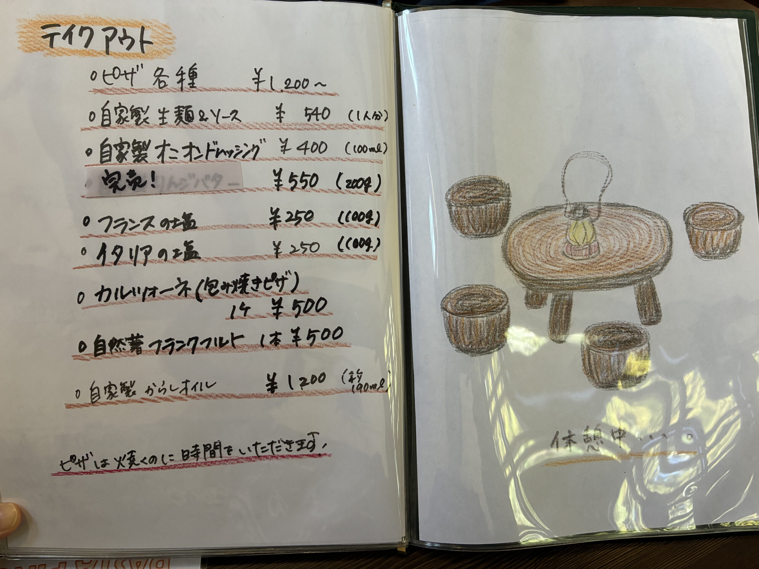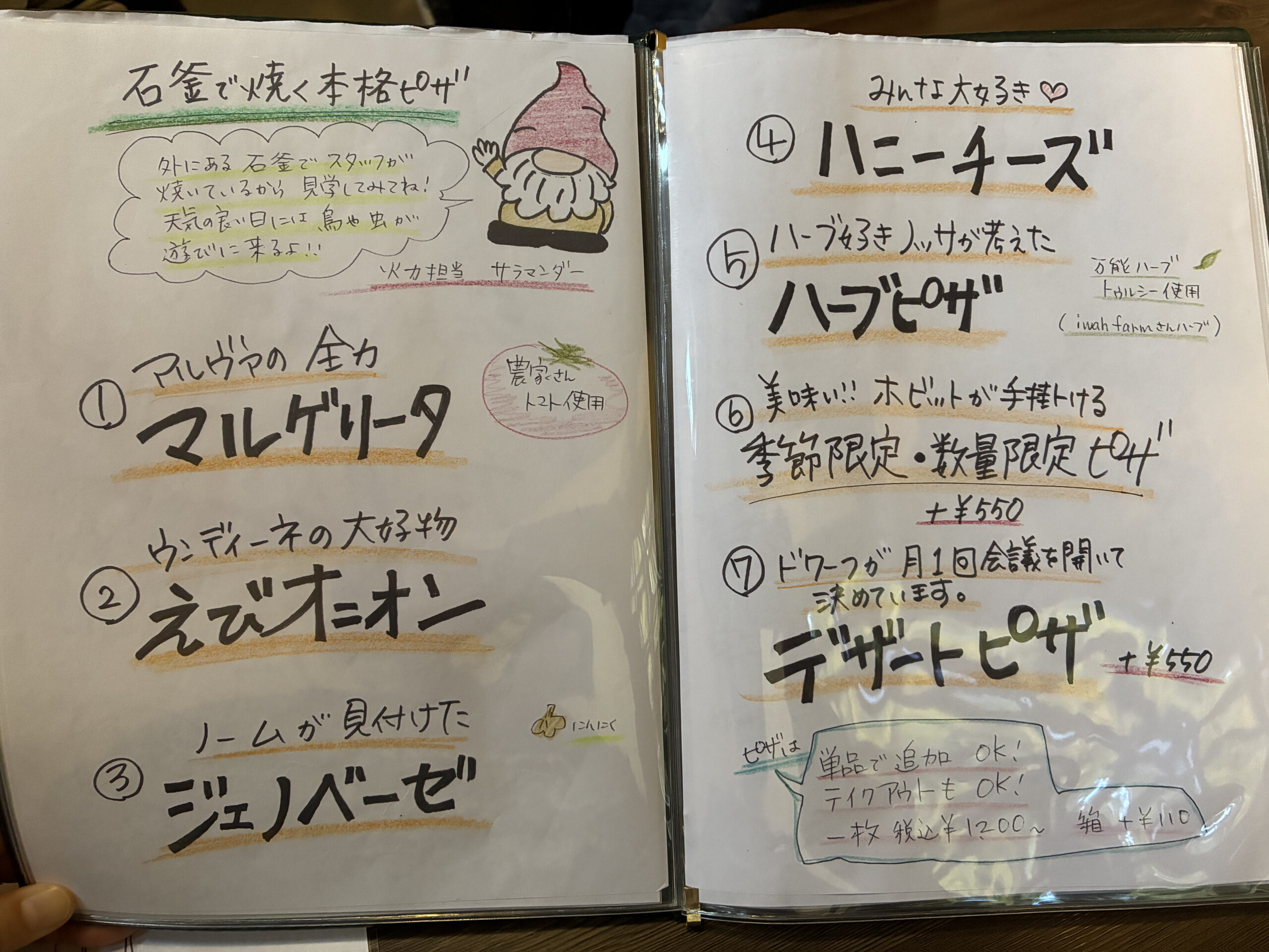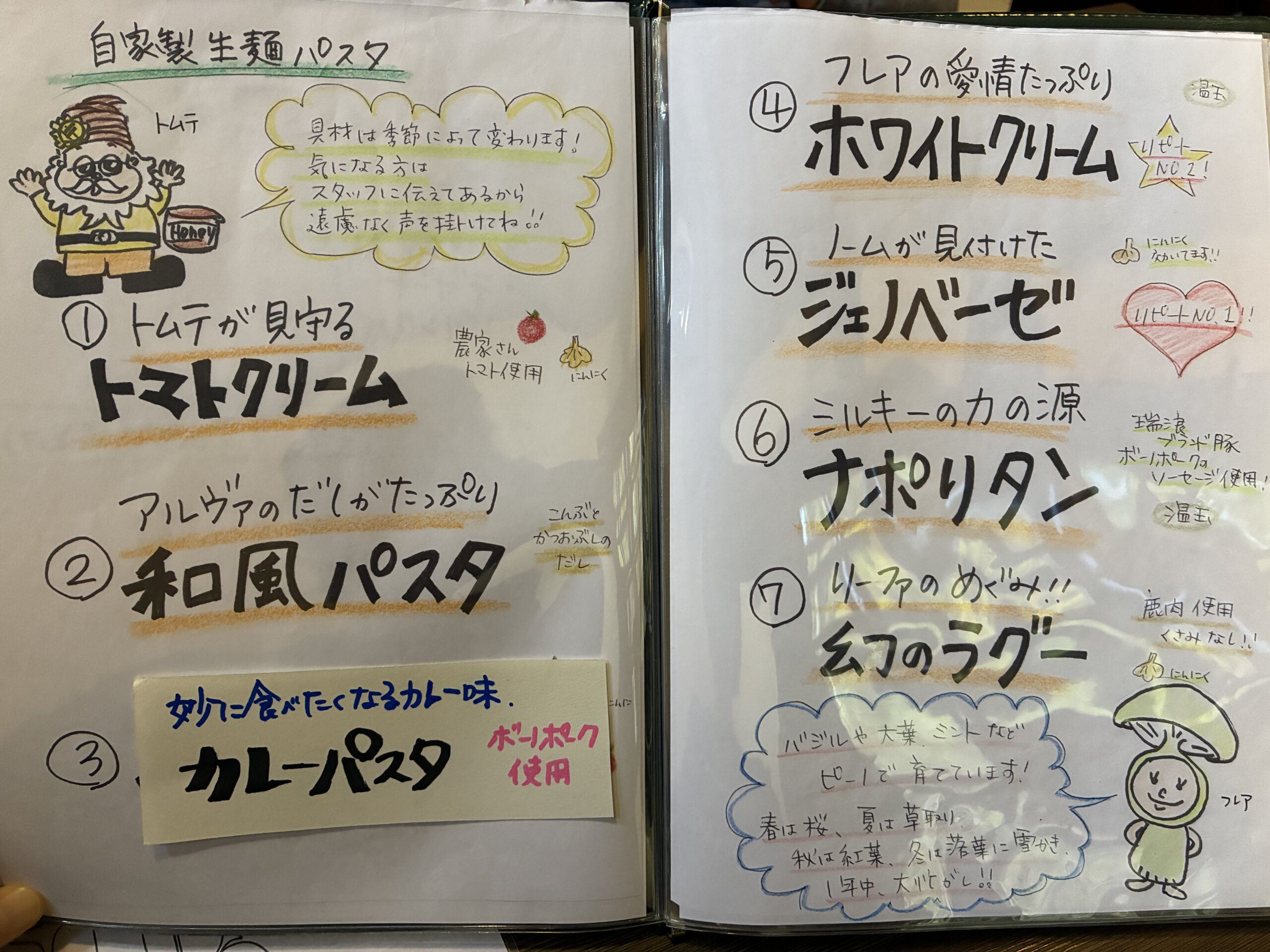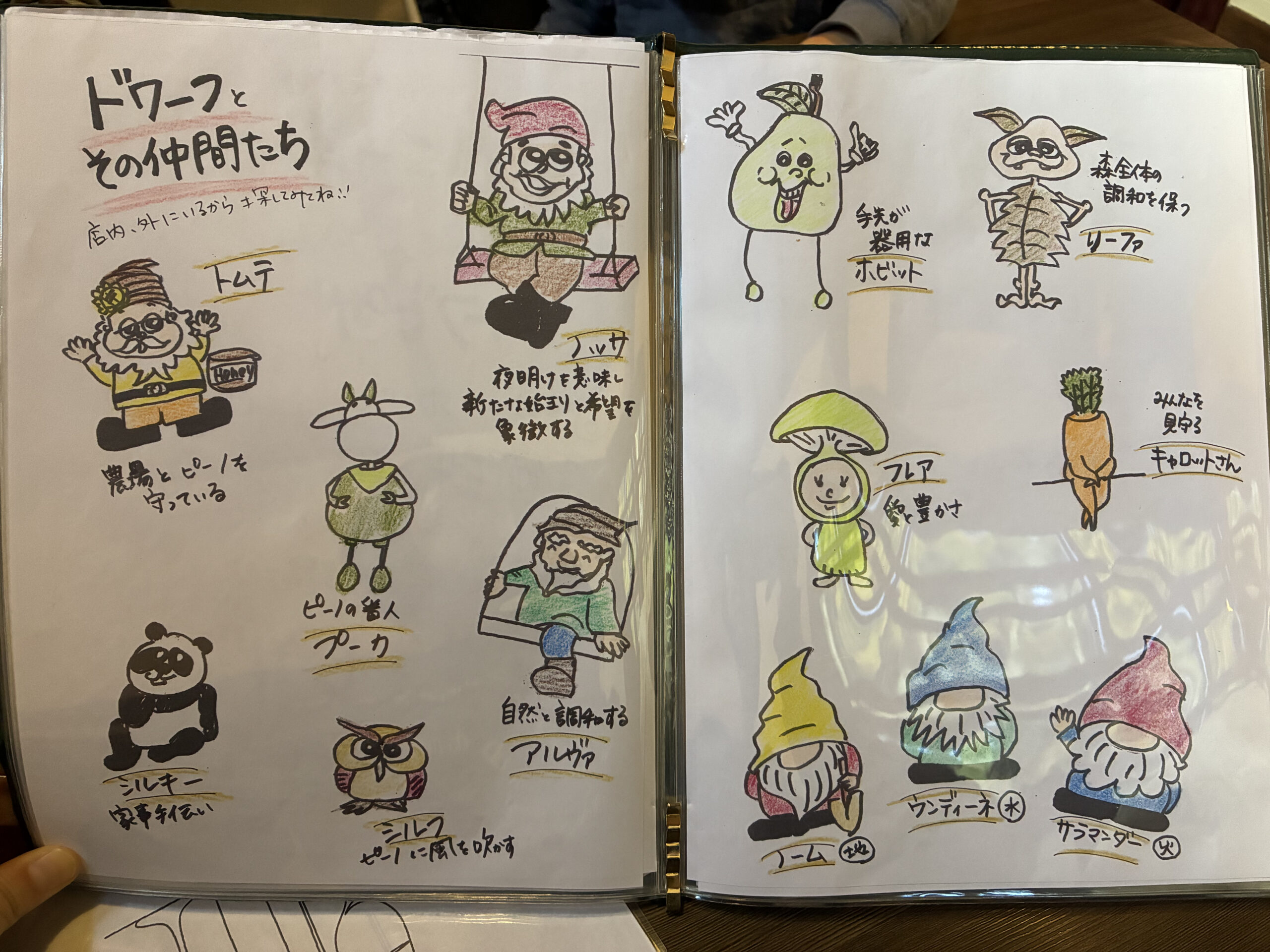 メニューの最初のページには森の妖精たちの紹介が、手書きのイラストで描いてありました。