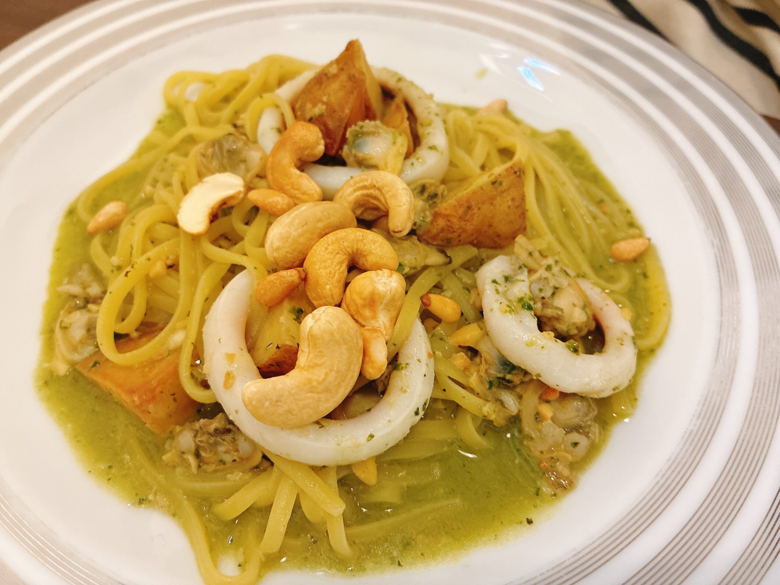 こちらが「ジェノベーゼのパスタ」。具材はこの日はいかとジャガイモとナッツでした。