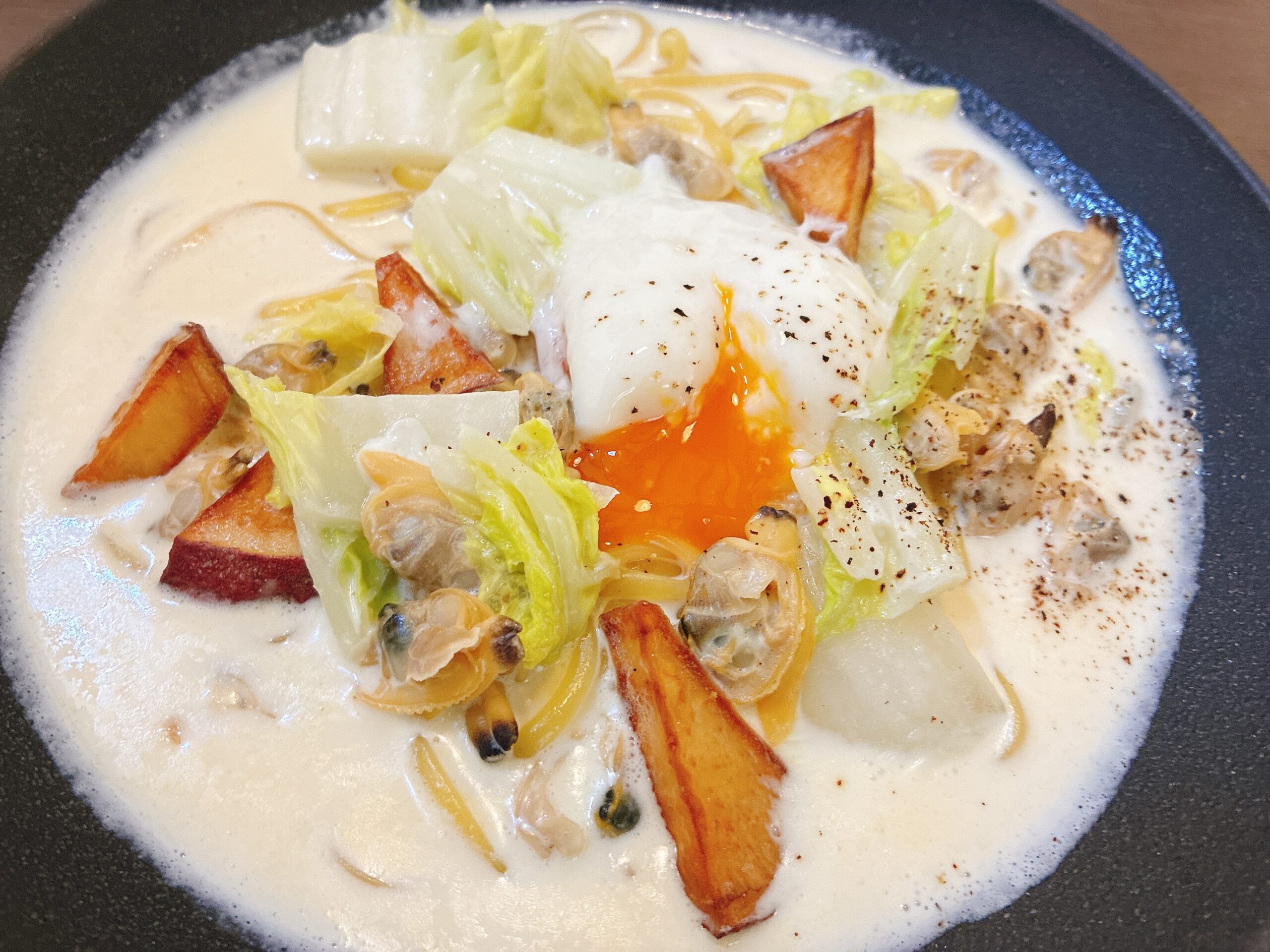 こちらは「ホワイトクリームのパスタ」。具材はアサリと白菜とさつまいもでした。